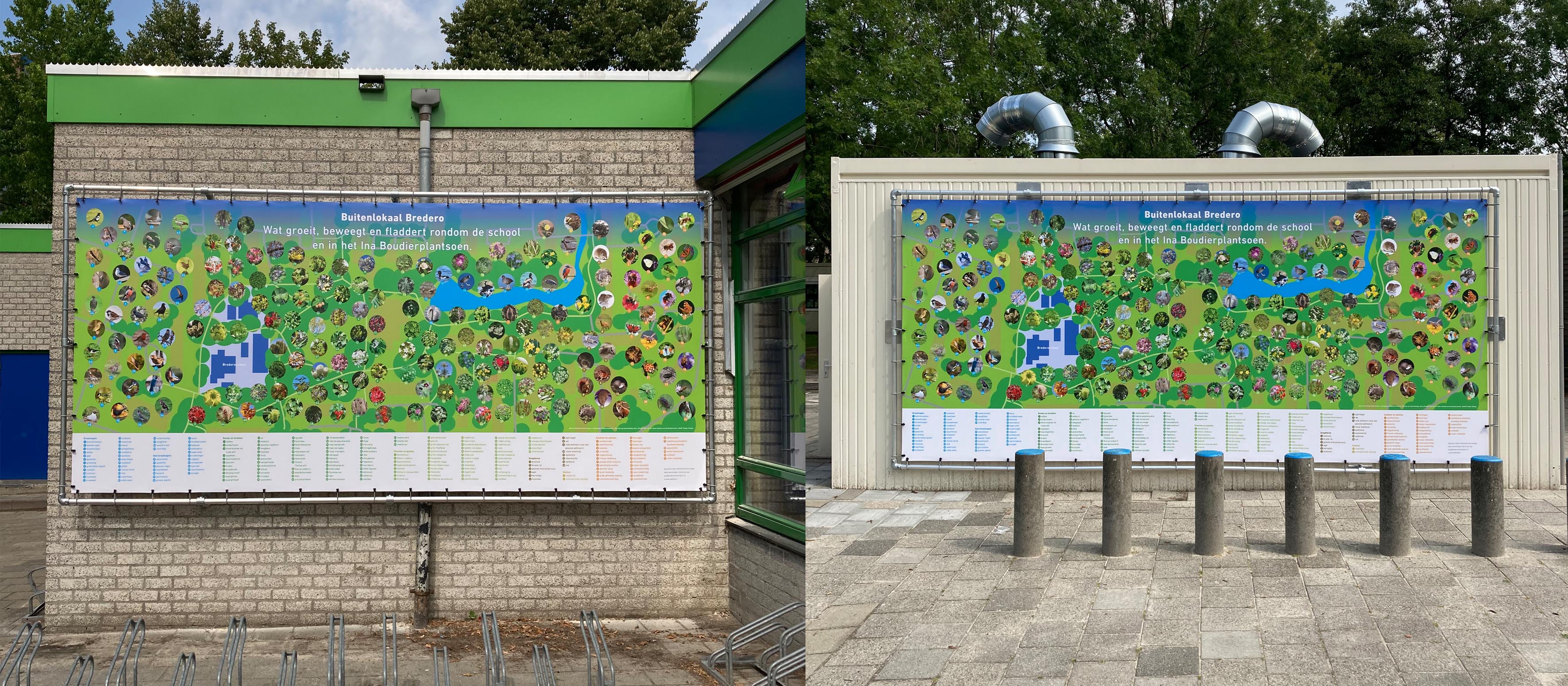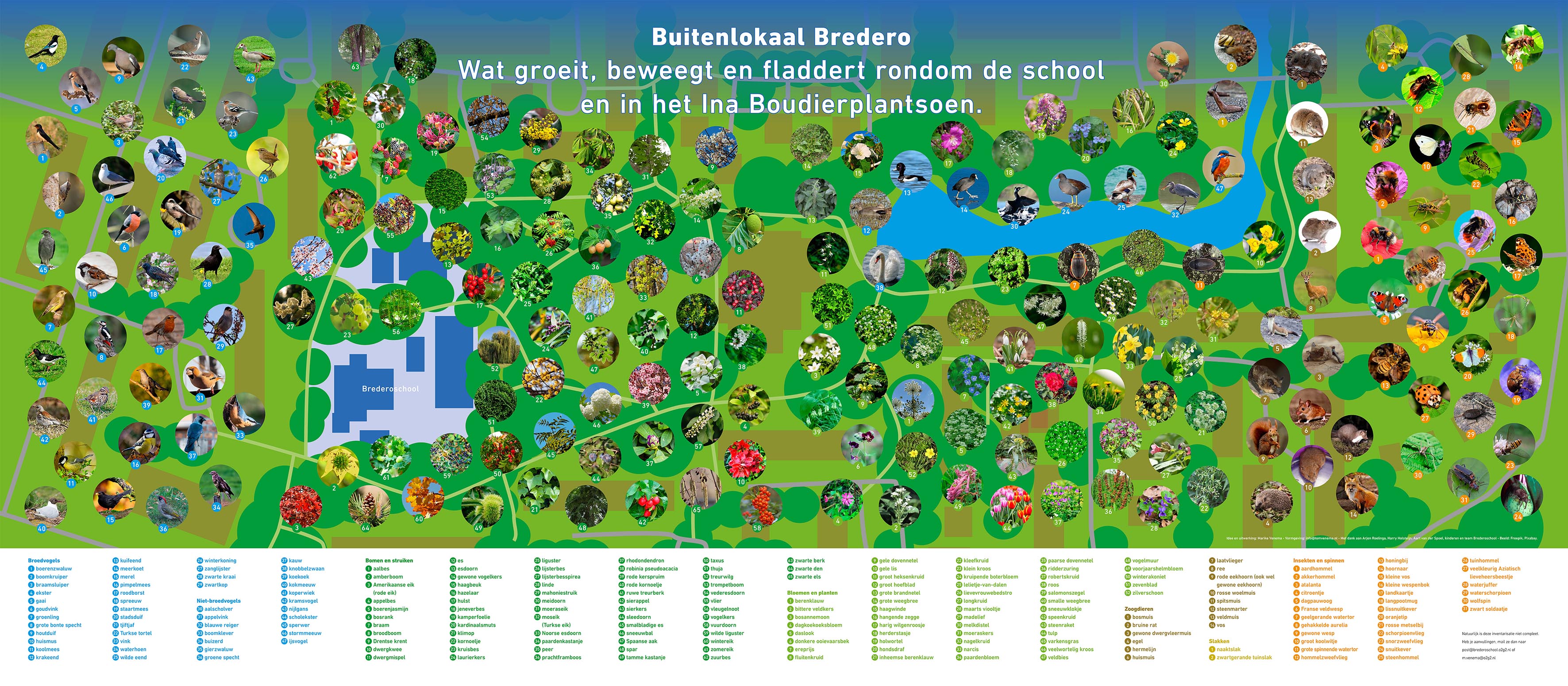 Dit geveldoek van 5 x 2,5 meter hangt aan de Brederoschool in Groningen. Kinderen, jongeren, ouders en buurtbewoners worden zo bewuster van de natuurlijke rijkdommen, die letterlijk voor hun voeten liggen. Bovendien wordt de leefomgeving verfraaid omdat een op zeildoek geprint en op een frame gespannen beeldverhaal een blinde muur (binnen of buiten) aan het oog onttrekt. Behalve voor scholen kan een overzicht ook met en voor Kinderdagverblijven en Buitenschoolse Opvang gemaakt worden. Mét, want kinderen maken samen met bijvoorbeeld vrijwilliger (ouder met veel kennis op dit gebied), stagiair, docent of begeleider de inventarisatie. De feestelijke afronding van dit educatieve project is de onthulling van het doek.